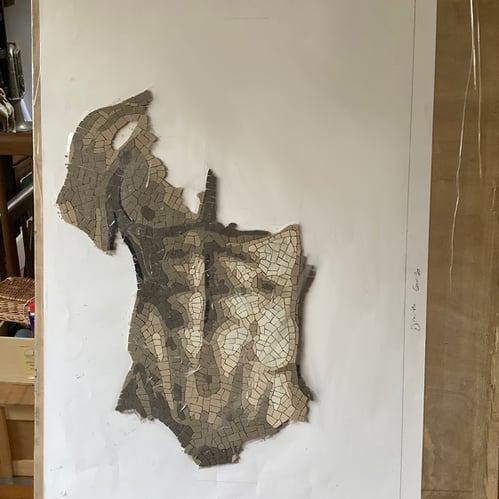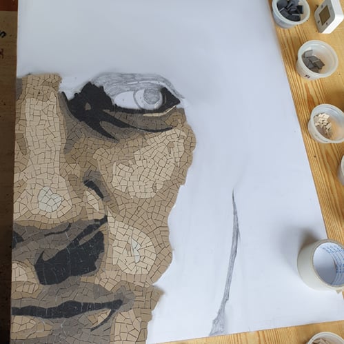 For Goa, creating mosaic is like making a puzzle with porcelain stoneware pieces that he cuts and re-cuts until the pieces fit together perfectly, gradually revealing a shape, a face, a body...